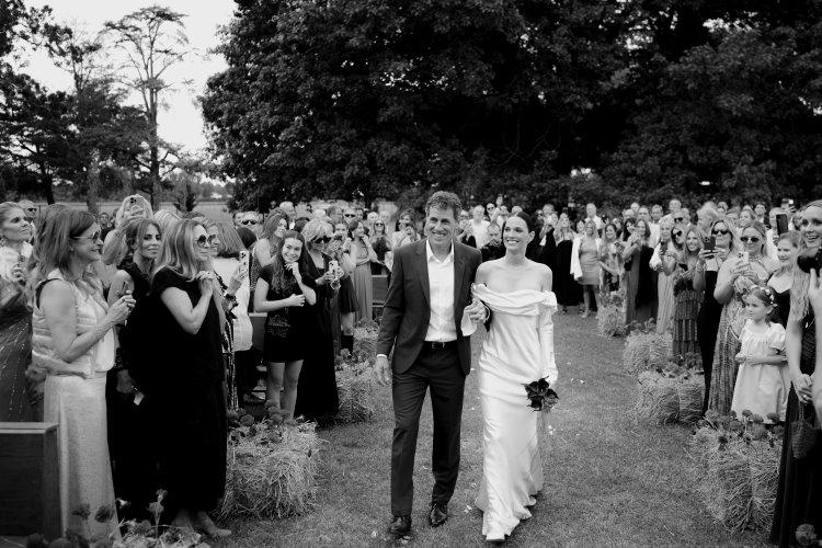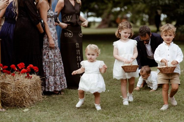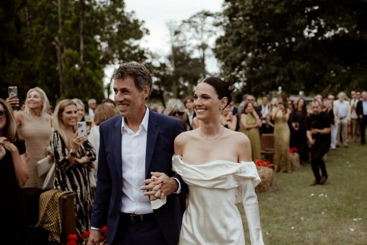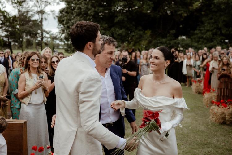 La ceremona fue en la capilla del campo. La novia entró a las 5 de la tarde con su padre al son de Cuidame de Silvina Moreno. Los casó el Padre Carlos Barreiro. La música de la ceremonia estuvo a cargo de una de las mejores amigas de la novia, Mora Del Fresno