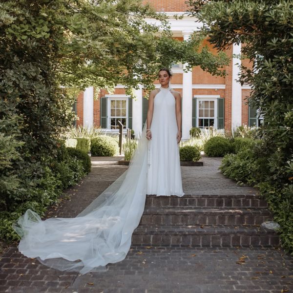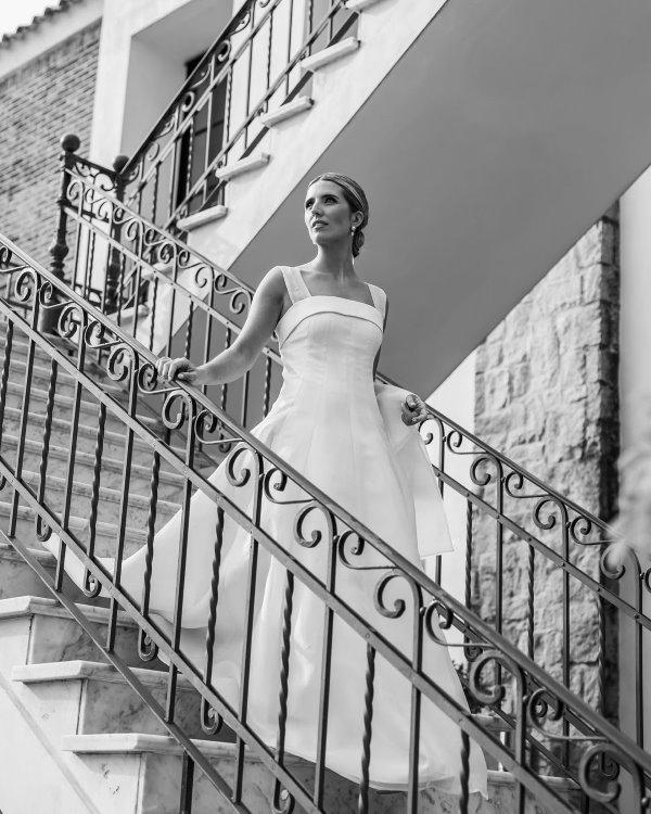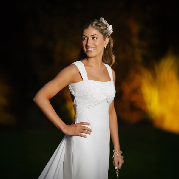El vestido de Mercedes era un diseño de Clara Laborde drapeado en malla red de color oro pálido sobre un satén italiano, con un tajo que aportaba movimiento. Como tocado llevó una bandana de tul en la cabeza y un ramo de anturios blanco y hojas de magnolia de @villa9ypico. La maquilló Emily Mc Cubbin y la peinó @alecalfo