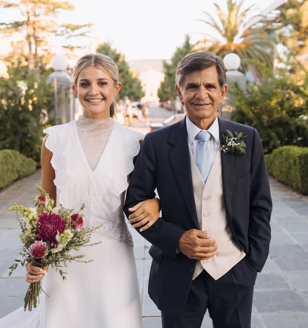 Llevó también el rosario de su amiga Carme, ramo de @luisjavier_estudiofloral, y un velo etéreo que solo usó para entrar a la iglesia y sacarse fotos. La maquiiló Martina Campomar y la peinó Cleo by Flo Pollio.