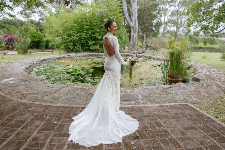 La novia llevó un vestido que compró de viaje y “fue intervenido, modificado y transformado por Agnes Lenoble”, contó la novia. El vestido era con escote halter en encaje de estilo portugués, crochet y cuero. llevó un tocado de Cleo by Flo Pollio y la maquilló Consi Nicola.