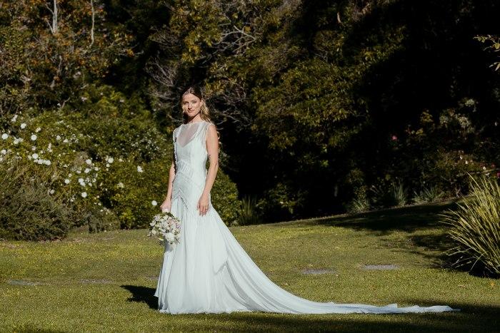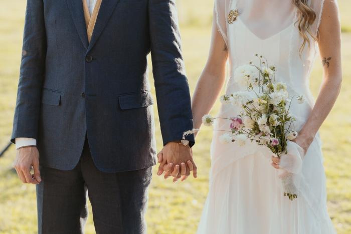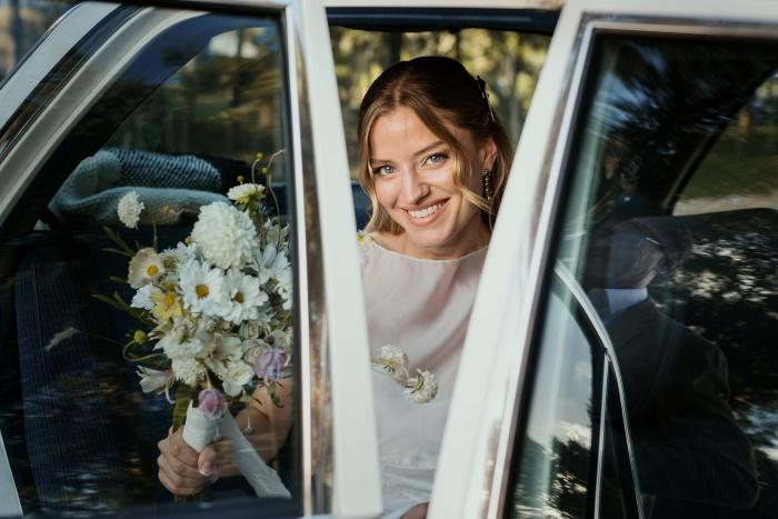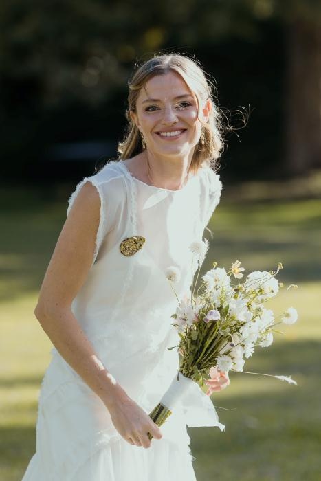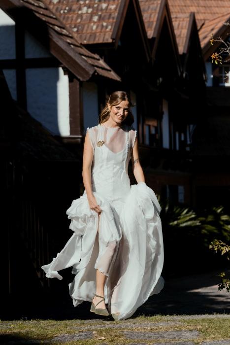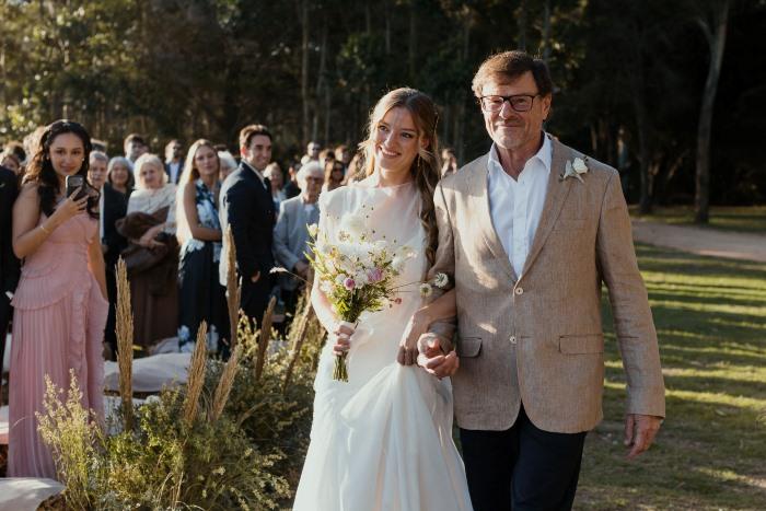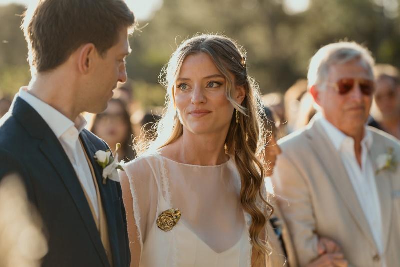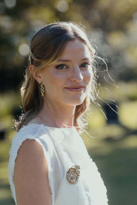 Como accesorios la novia llevó un prendedor, dos broches, uno a cada lado de la cabeza, y unos aros haciendo juego que diseñaron con Macarena Cancela. “Lo diseñamos juntas, desde el principio queria un pin en el vestido y que haga juego con los broches en el pelo, priorizamos algo sencillo y pelo suelto, acompañado el mood campo”.La peinó Natalia Rojas y la maquilló Martina Campomar.